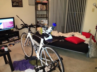 Since it is crutch-time for Lake Placid, my living room is now converted. I made my sofa into my "nap bed." Once I get off my bike, I crash for an hour, then get back on the bike. It's a sweet set-up to say the least. Life of a triathlete. |