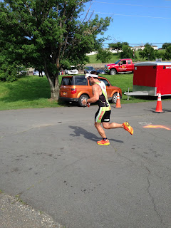hopped aboard 'da batmobile' and went to work. the course was quite hilly for the first half, but i loved the climbing. didn't want to hurt myself too much, but the engine was motoring along, so i kept pedaling along. the final mile was straight downhill back to the river, which crosses cobblestone patches. thought i might pee my pants, which is cool in triathlon, but thankfully, made it back in one piece and looked to tackle the run.